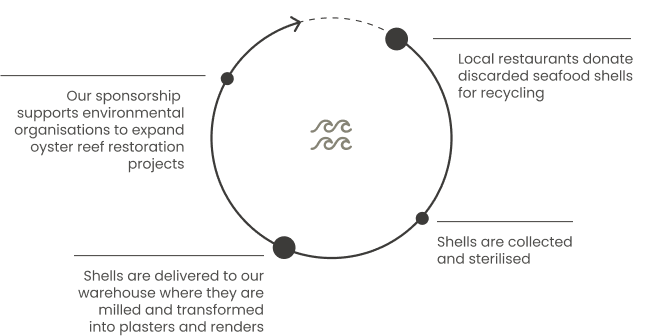 Each year, more than 10 million tonnes of shell globally ends up in landfill. We’ve partnered with environmental and social organisations to divert discarded oyster shells from landfill and transform them into uniquely beautiful architectural coatings.